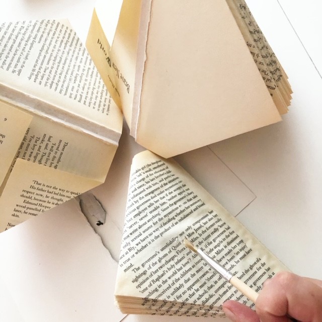 - Bij mijn grote vaas heb ik 3 gelijke pocketboekjes gebruikt en de diamant vouw. Het lijmen was lastiger maar ik heb de boekenvaas gebonden met verband en ben bovenop extra gaan lijmen met een kwastje. Telkens wat lijm bovenop en dit netjes verdelen met het kwastje, laten drogen en dan de andere kant.