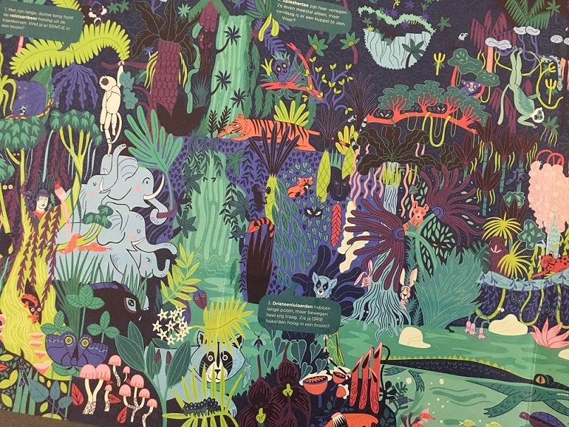 Dag en nacht in het regenwoud is door zijn lay-out echt anders dan andere zoekboeken. Vooral de glow in the dark zijde van het regenwoud viel hier thuis enorm in de smaak! Je moet er van tevoren wel even aan denken om de bladzijde onder een lamp te leggen. Maar we waren verbaasd hoe goed de illustraties oplichten in het donker.