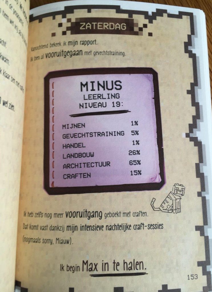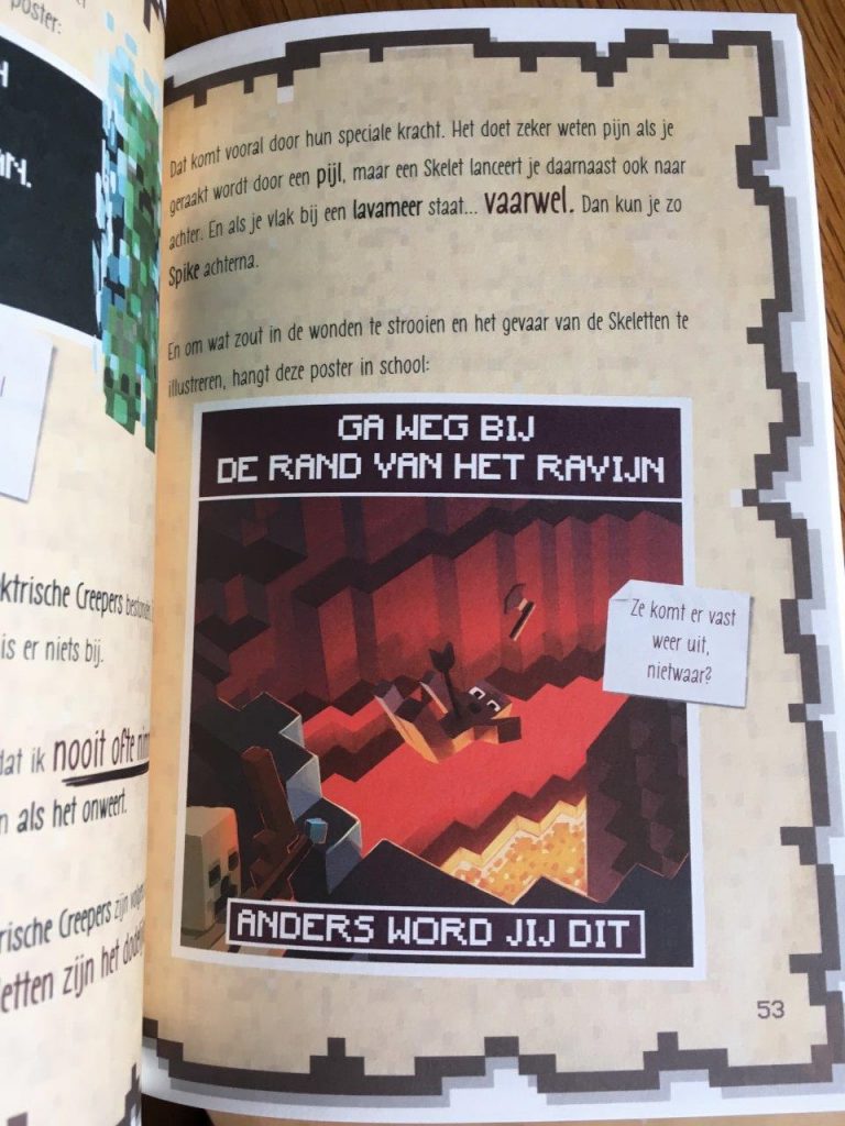 Volgens mij is het verhaal van ‘Dagboek van een noob krijger’ levendig genoeg en heeft het niet het Minecraft- vehikel nodig om leuk te zijn. Maar toegegeven, het populaire Minecraft trekt wel de aandacht van de kinderen. Dat heeft een positieve invloed om kinderen dit boek te laten lezen. Bijkomend voordeel: het Minecraft-tintje geeft hen meteen een voorsprong ten opzichte van de niet-Minecrafters, zoals deze ‘beetje ouderwetse moeder’ (ik citeer mijn oudste dochter). Voor hen die onbekend zijn met het spel is het verhaal soms lastig te volgen omdat er wat Minecraft jargon in voorkomt. Dat vindt dochterlief dan overigens wel weer leuk: dat haar moeder daar niets van begrijpt.