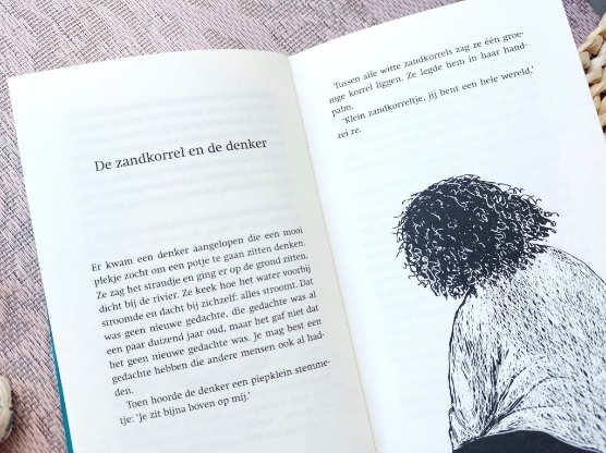 Zo leren we bij iedere ontmoeting weer iets nieuws, in begrijpelijke en tegelijk diepzinnige taal. Bijvoorbeeld dat een zandkorrel ogenschijnlijk niet veel voorstelt omdat ze allemaal hetzelfde zijn. Maar dat elke zandkorrel toch uniek is. Aandachtig kijken naar de wereld om je heen, dat is een mooie en wijze les. Waarom vinden we iets mooi of lelijk? Is eigenlijk niet alles waardevol om ons heen? Zelfs de straattegel en een liniaal.