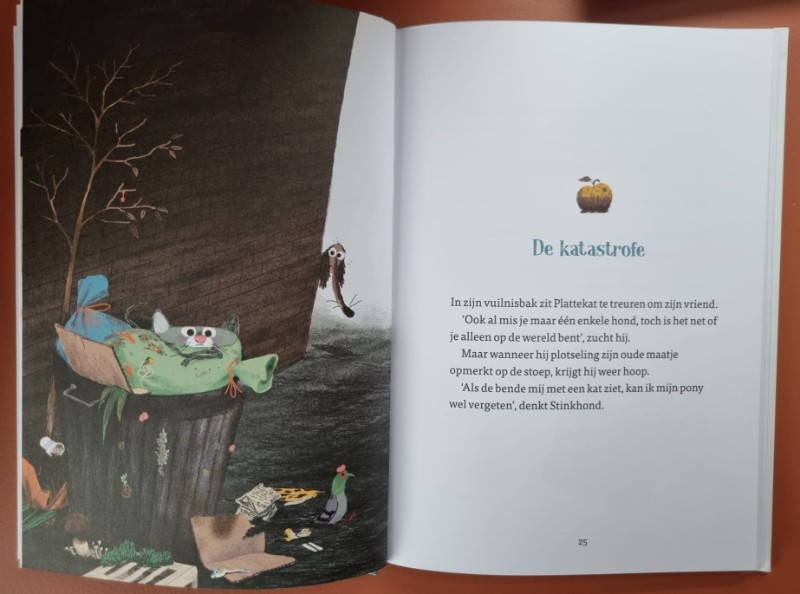 De Ponystrijders? Ik dacht… dit is toch geen paardenboek? Al gauw kwam ik erachter dat het ging om de haren van de honden, die als een pony voor de ogen hingen. Het hebben van een pony is volgens de Ponystrijders het gevolg van hard vechten voor ‘hun soort’. Ze gaan dan ook de strijd aan met de katten. Dus ook met Plattekat. Stinkhond komt samen met de bende dan ook in de gekste situaties om de katten te pesten. Andersom zijn er ook genoeg katten die het op Stinkhond en de andere bendeleden hebben voorzien.