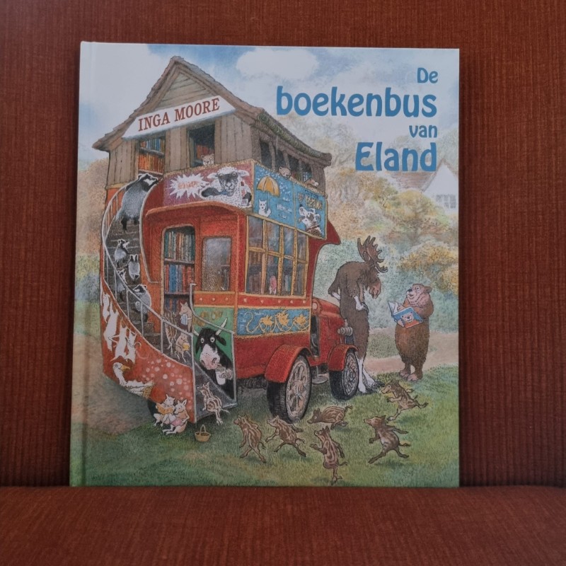 Bovenstaande flaptekst staat op de cover van De boekenbus van Eland. Inga Moore schreef en illustreerde dit boek.