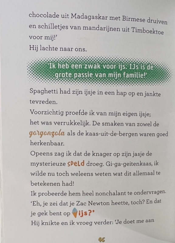 Als je mij vraagt waarom ik deze boeken leuk vind én aanbied in mijn groep heeft dat verschillende redenen. De schrijvers achter het concept van Geronimo Stilton verwerken humor op de meest originele manieren. Dit doen ze door teksten visueel te maken door gekke letters, vormen of kleuren. Echter passen ze dit ook toe in geschreven woordgrapjes. Vervolgens zijn de illustraties hierop afgestemd en kleuren de bladzijdes mee naar de stemming van het verhaal. Hierdoor wordt je als lezer in het verhaal betrokken en wil je blijven lezen. Zo ook in De club van Mysteriejagers.