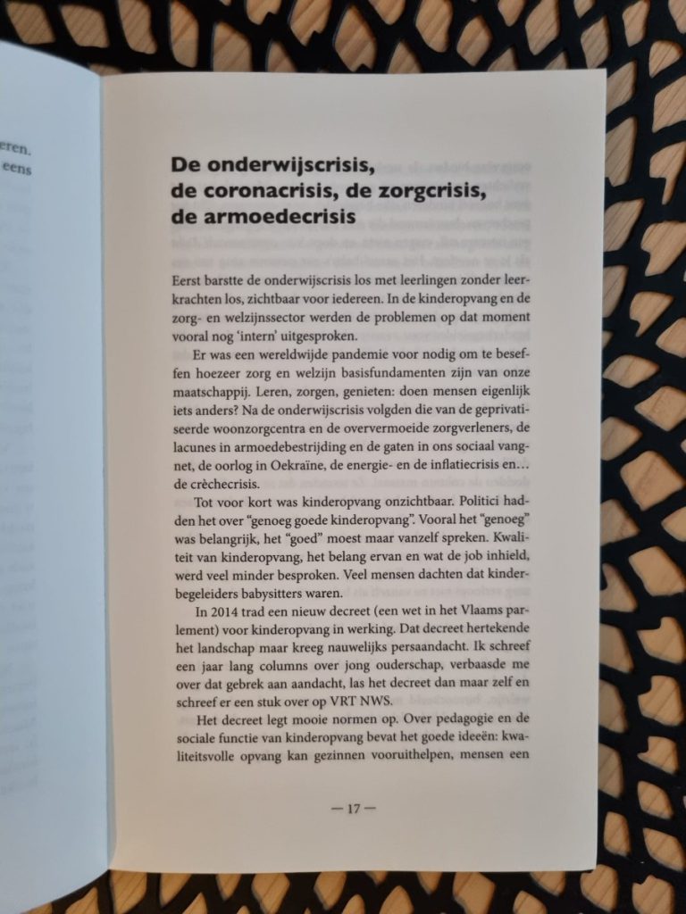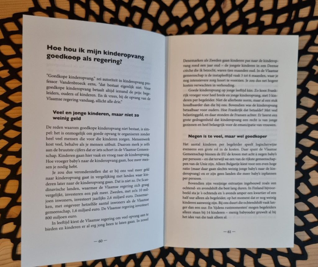 Dat het zich afspeelt in Vlaanderen was af en toe wat ingewikkeld, want ik ken de situatie niet precies, maar zoals gezegd ook verhelderend en inzichtgevend. Het is dus absoluut leesbaar voor Nederlandse lezers. Af en toe vind ik het taalgebruik en zinsconstructies wat complex, je moet er wel even voor gaan zitten. Aan de andere kant is het boekje overzichtelijk qua dikte en daarmee ook goed behapbaar. Interessant voor mensen die geïnteresseerd zijn in kinderopvang en wat dieper willen nadenken over mogelijke oplossingen voor deze ingewikkelde crèchecrisis.