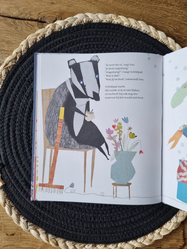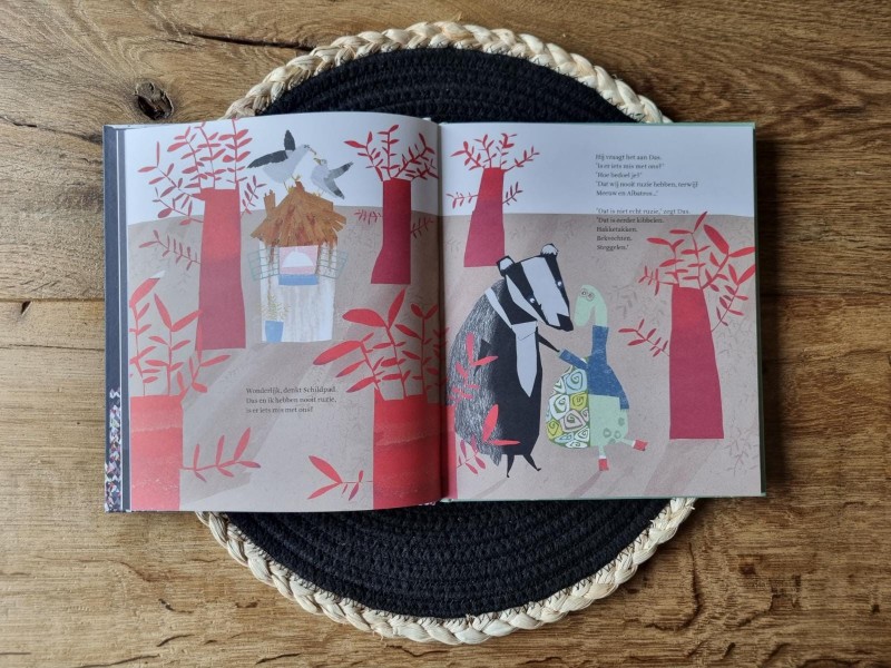 Wat De droom van Schildpad ook zo rijk maakt, zijn de prachtige illustraties van Barbara de Wolf. Zij werkt al bijna twintig jaar als illustrator en heeft al tientallen boeken op haar naam staan. Ook Het geluk van Schildpad heeft zij geïllustreerd. Op de cover prijkt Schildpad. Een modern gemaakt dier, bestaande uit verschillende vlakken. In het boek zijn de illustraties gemaakt met meerdere technieken. Ik zie het gebruik van papier en verschillende druktechnieken.