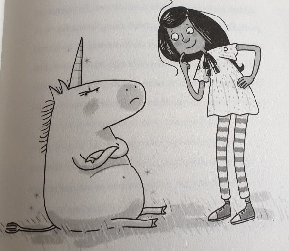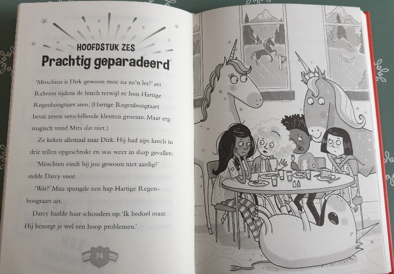 Ik moet zeggen dat als je de voorkant en achterkant van het boek hebt gezien je een boek verwacht vol regenboogkleuren en glitters. Maar aan de binnenkant is hier niets van te zien. De illustraties zijn volledig in het zwart wit. De kleuren en glitters zijn op magische wijze verdwenen en moet je er dus zelf bij bedenken! Dat is wat mij betreft prima, want het is een leesboek en geen prentenboek!