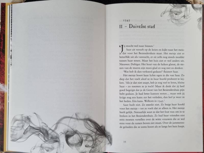 Dit is de titel van het eerste hoofdstuk van De Geest van het Besiendershuis. Op de eerste bladzijde zie je direct een foto van het Besiendershuis. Het boek trok direct mijn aandacht toen ik het opensloeg. Door middel van verschillende lettertypes, erg goed gekozen, wordt ik de geschiedenis ingetrokken. Het begin van het boek is een beetje ‘creepy’. Dit begint al bij de proloog: