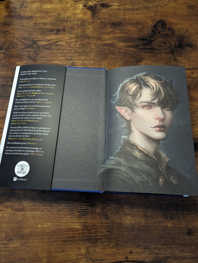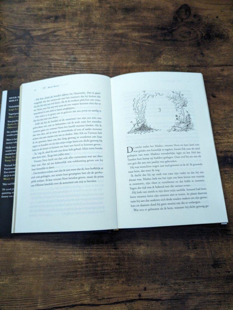 Naast de enorme hoeveelheid lof die ik hoor over het talent van Holly Black, intrigeert het design van dit boek mij ook. Deze limited edition van de gestolen erfgenaam Bevat prachtige illustraties van prins Eik en Suren. Begin van hoofdstukken zijn versierd, passend bij de cover van het boek. Het boek heeft goudfolie op snee, ga zo maar door. Hierdoor is het een pareltje om te zien. Door het blog heen kun je meer foto’s hiervan zien.