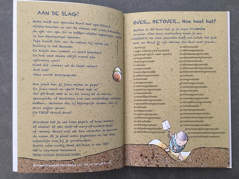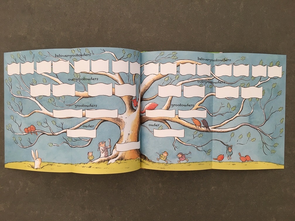 Het boek is dus vooral een heel persoonlijk boek om je eigen familiegeschiedenis te noteren. Het werkt eigenlijk hetzelfde als een vriendenboekje: je kind kan bijvoorbeeld papa of oma de bladzijdes in laten vullen, of ze kunnen dit samen doen.