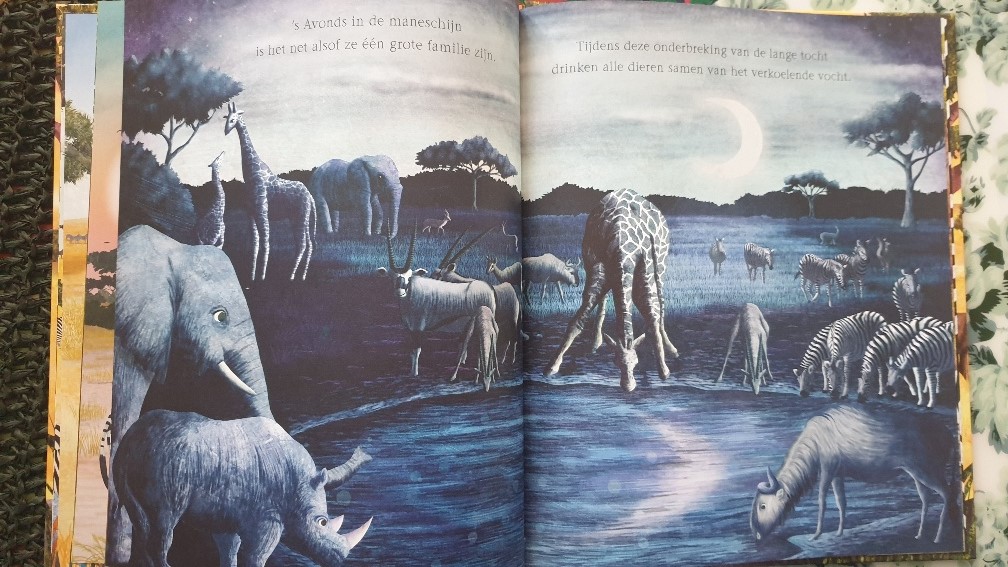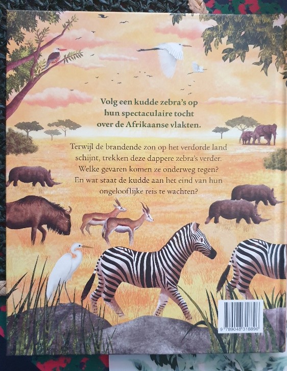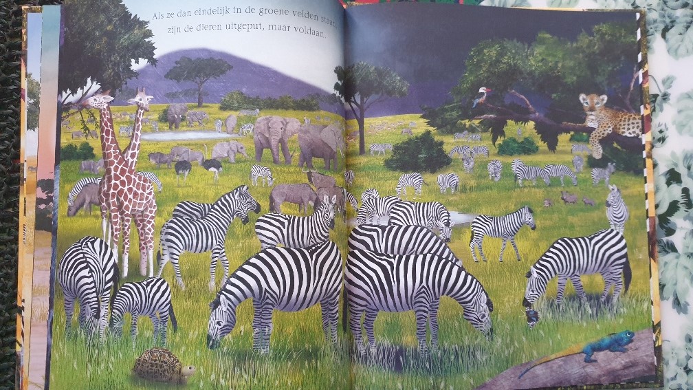 De zebra’s gaan dus op een grote trek, ze ruiken al in de lucht als het weer tijd is om te gaan vertrekken. Andere dieren reizen met ze mee, maar de leeuwen verroeren zich niet. Olifanten, wilde zwijnen, neushoorns, buffels, giraffes en vogels. De meeste te voet, anderen vliegend of liftend op de rug van een olifant. Soms vluchtend voor gevaarlijke krokodillen, maar met een prachtige eindbestemming. Vers groen gras.