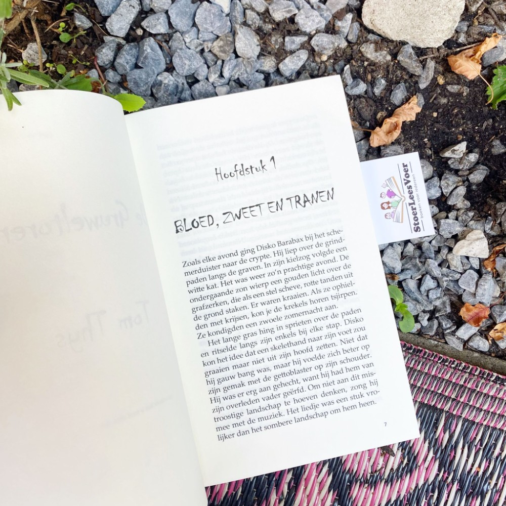 We gaan weer terug naar Kaat en Gideon die we hebben leren kennen in deel 1. Daarnaast is er ruimte voor 2 nieuwe karakters. Ik vind de locatie en de karakters erg leuk van De gruweltoren 2. Het hele verhaal is nieuw en vers, maar staat wel in de schaduw van De gruweltoren, letterlijk en figuurlijk. De locatie is een begraafplaats pal naast het sinistere flatgebouw uit deel 1. De rode draad van het hoofdverhaal in het nu is voor mij spannender dan die vanuit het eerste deel. We gaan van een grote hoogte naar zeer donkere diepten. Een zeer herkenbaar boekje (dank wederom voor de link naar Barker) gemaakt van een zeer bijzonder leer bevat woorden die je beter niet kan uitspreken.