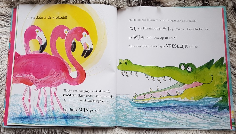 Er is dus schijnbaar 1 hapgrage krokodil. Hij verslindt dieren en wil de poel niet delen met anderen. Maar de flamingo’s zijn niet bang! Zodra ze in het water stappen is hij daar. De hapgrage krokodil die dieren verslindt en de poel is van hem. Maar de flamingo’s zijn helemaal niet bang. Ze melden de krokodil dat ze roze en beeldschoon zijn en niet om op te eten. Doet hij dat toch dan krijgt hij vreselijk de hik! Dat wil de krokodil niet en hij zwemt weg.