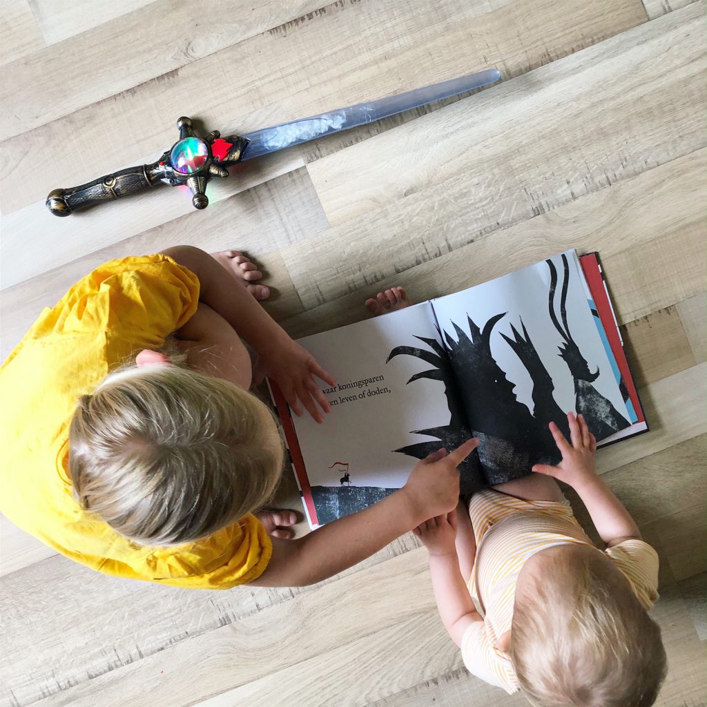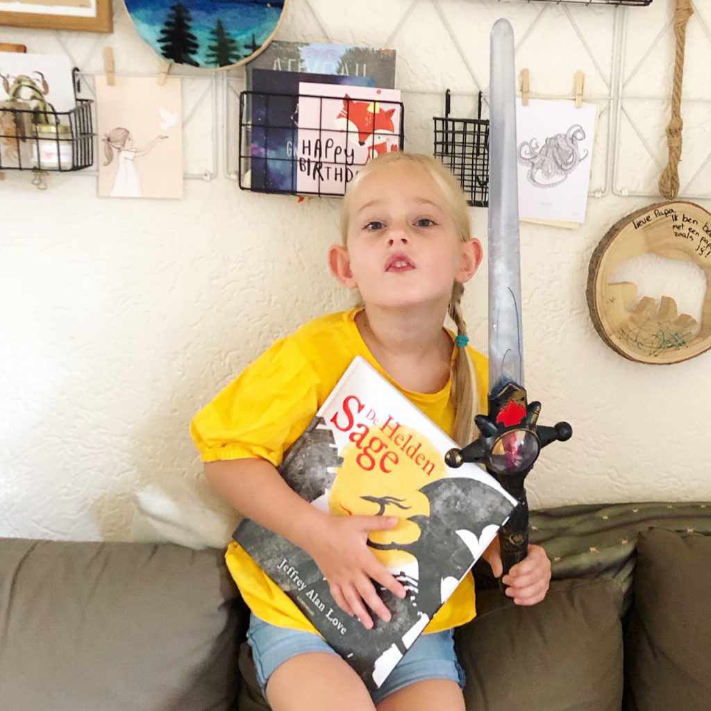 Mijn oudste dochter vind het geweldig. Met grote ogen laat ze zich meevoeren in het verhaal van ‘De heldensage’. Ik lees het extra spannend voor en laat haar naar de illustraties kijken en haar eigen invulling geven. Ik maak het niet enger dan nodig, maar stook wel de spanning een beetje op. Vervolgens zie ik haar dit boek bij haar kleine zusje leggen en het verhaal met dezelfde spanning overbrengen. Haar kleine zusje imiteert voornamelijk het gedrag van haar grote zus en wijst naar de plaatjes en zegt dan oeeee.