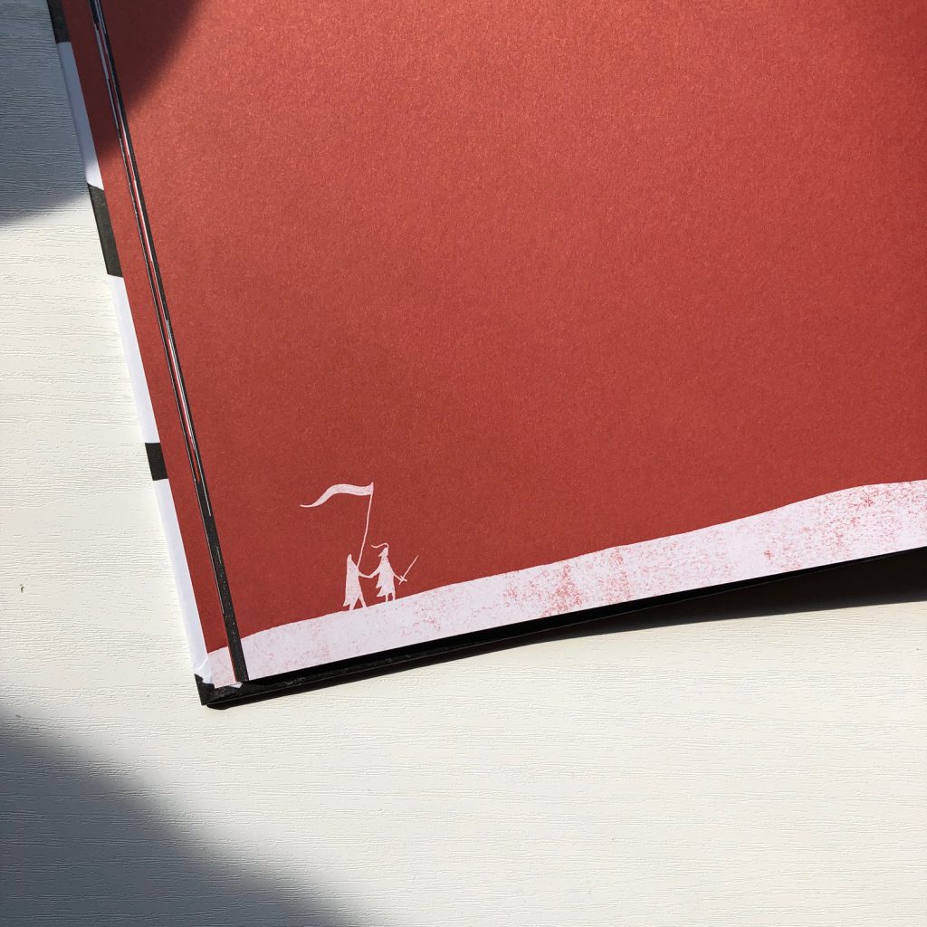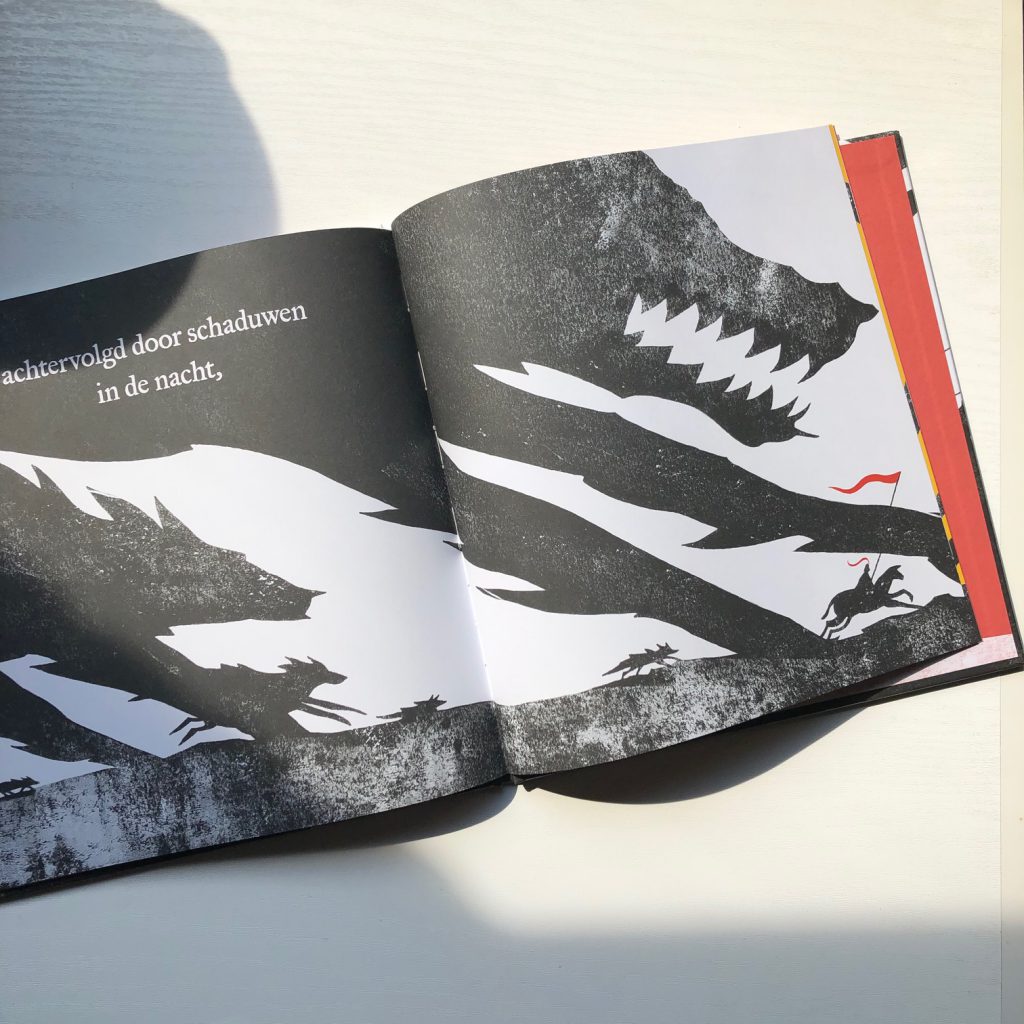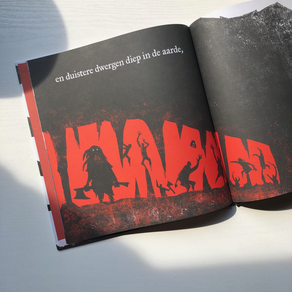 Is dit boek dan voor grote kinderen en is er een waarschuwing nodig? Nee joh, het is een kindvriendelijk boek zonder gruwelijkheden maar met de perfecte sfeersetting van een sage voor een jong publiek. De illustraties zijn spannend genoeg en laten veel ruimte om de jonge fantasie op hol te laten slaan. Het bloederige zit in de prachtig rood glimmende letters op de kaft. De tekst is kort en eervol naar hoe een sage hoort te zijn. De heldensage is alles wat het hoort te zijn voor de juiste leeftijd.