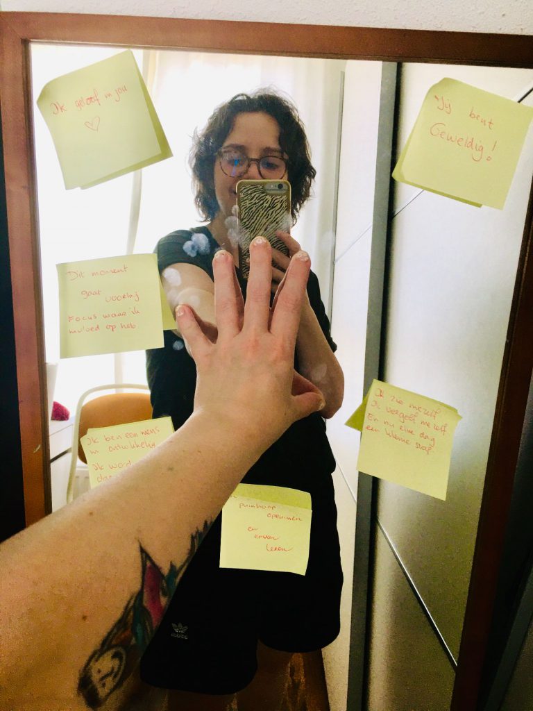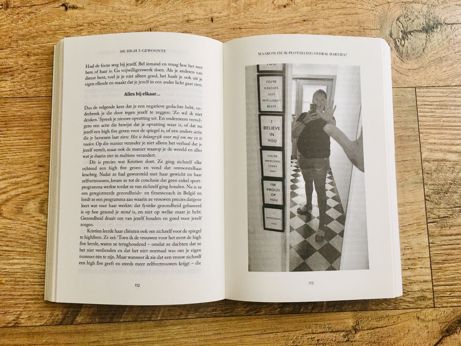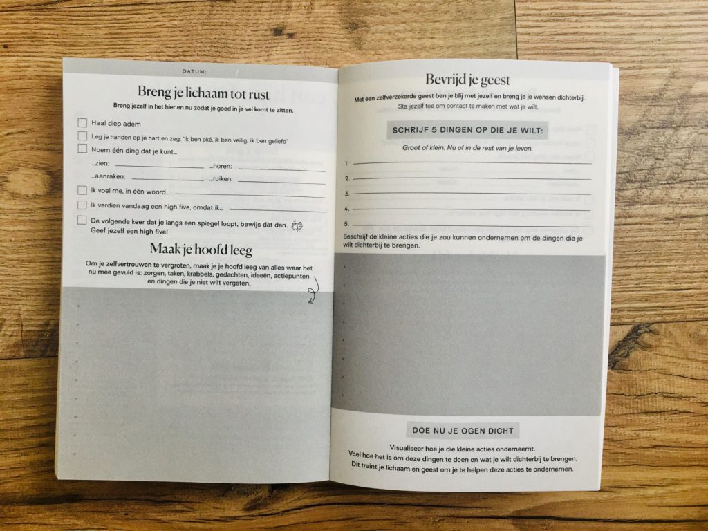 Eigenlijk is de High 5 in de spiegel zo’n mantra en knuffel voor jezelf tegelijk. Mel Robbins reikt je letterlijk en figuurlijk aan hoe je tot een positieve mindset komt inclusief alle mindfucks waar je doorheen gaat, hoe je kunt omdenken en tot actie kunt komen. Voor mij werkt de High 5 ’s ochtends in de spiegel met daar een paar vaste mantra’s bij goed. Dus een lekkere start van de dag! Deze High 5 is onderdeel van dé ultieme mindfulness oefening die aan het einde De High 5-gewoonte te vinden is (zie onderstaande foto).