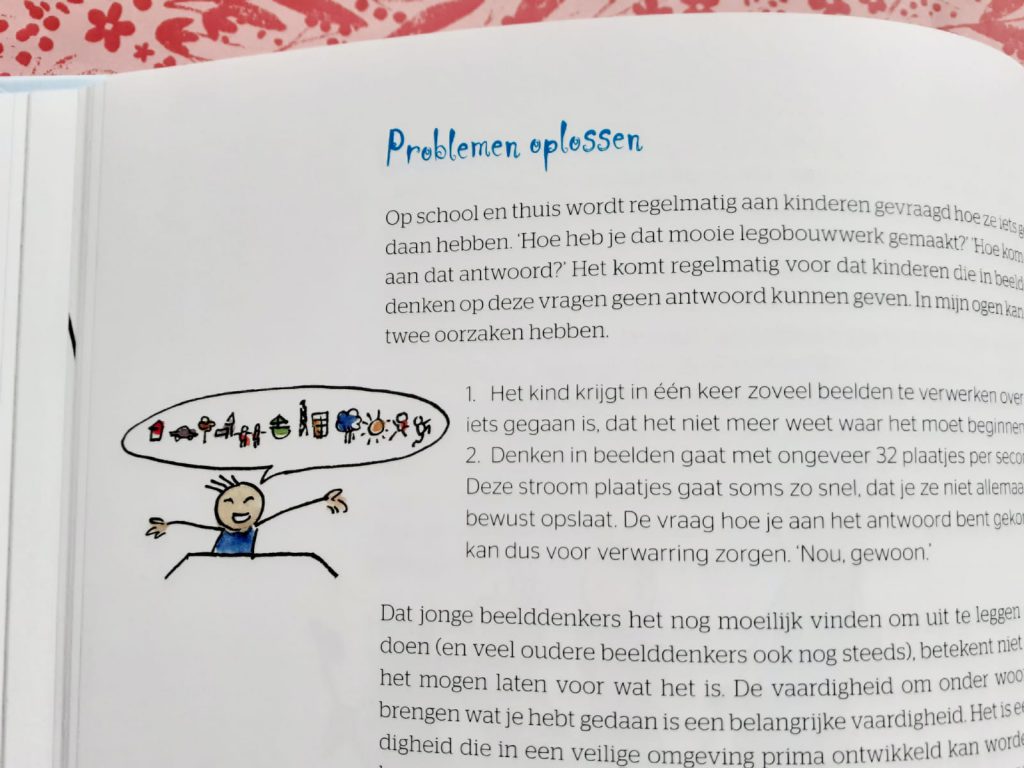 Of kinderen echte beelddenkers zijn, is bij kleuters zeker nog niet definitief vast te stellen. Maar zo geeft schrijfster Tineke Verdoes aan: het is wel belangrijk om signalen te herkennen. In het boek worden de kenmerken goed uitgelegd, met voorbeelden uit de praktijk. Daardoor krijg je een beter beeld van wat het concept inhoudt. En ook wat het verschil is met kinderen die meer talig en analytisch denken. Een kleine greep uit de gevarieerde kenmerken van de jonge beelddenker: