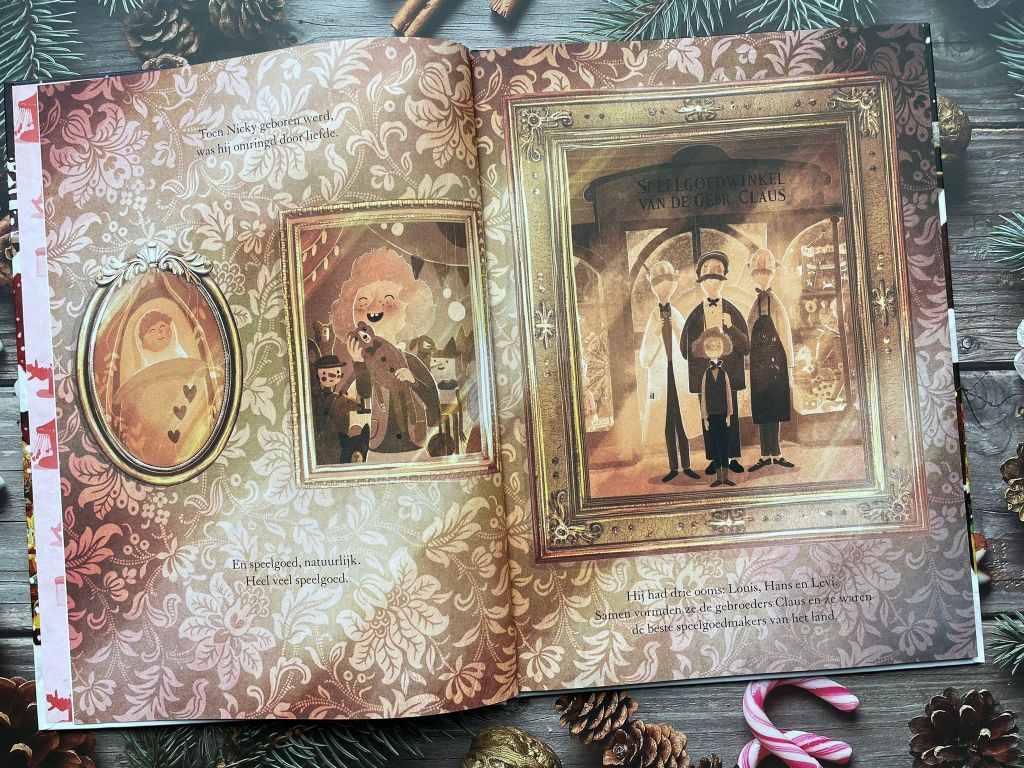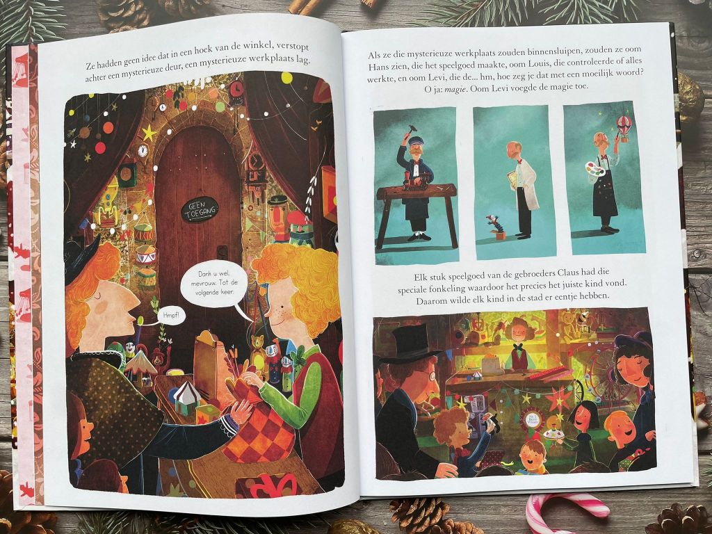En bij ‘De jonge kerstman’ ben je vanaf het zien van de kaft al verliefd op het boek. Deze kaft heeft glanzende en goudkleurige details en er is enorm veel te zien. Ook is het leuk dat de soort illustraties elkaar afwisselen. Zo heb je grote, pagina vullende tekeningen, maar ook wat kleinere, die een beetje als een strip zijn weergegeven.