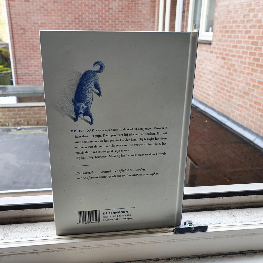 Beklijvend en meeslepend verhaal over een eenzaam jongetje. Een kwetsbaar verhaal over afscheid en verdriet, en hoe afstand je op een andere manier leert kijken. Op het dak van een gebouw in de stad zit een jongen. Binnen in hem doet het pijn. Daar probeert hij niet aan te denken. Hij wil niet deelnemen aan het gekrioel onder hem. Hij bekijkt het doen en laten van de man aan de overkant. Van de vrouw op het plein, het meisje dat naar school gaat, zijn mama … Hij kijkt, hij observeert. Maar hij heeft er niets mee te maken. Of toch?