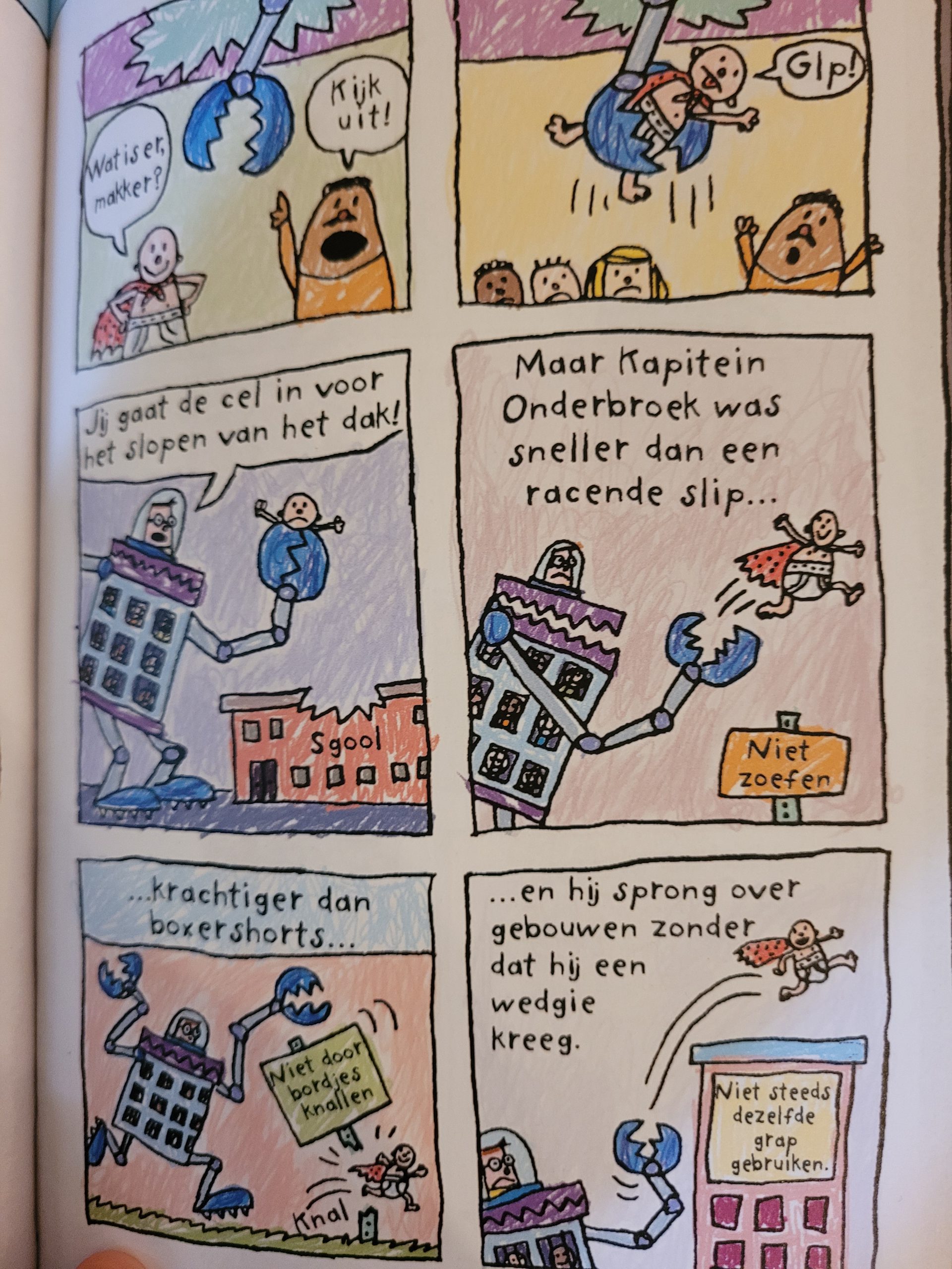 Net zoals bij het vorige boek over Kapitein Onderbroek dat ik heb gerecenseerd is een knotsgekke knokpartij ook volledig in kleur. Ik denk dat sommige dingen in het verhaal minder leuk zouden zijn als het in zwart-wit was. Bijvoorbeeld een bepaalde uitvinding van Melvin waar ik niks over kan vertellen omdat dat dan grote spoilers zouden zijn voor het oh zo geweldig grappige verhaal en dat jullie dat dan niet meer hoeven te lezen omdat ik dan al een veel te groot deel van een knotsgekke knokpartij verteld heb. Helaas is er in dit verhaal geen pagina waar te zien is hoe je de karakters moet tekenen. Dat was in het vorige boek wel.