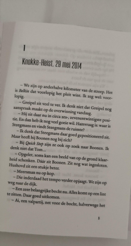 Wanneer ik De koers lees, bevind ik me helemaal in de wielerwereld. Louis van Dievel neemt mij echt mee in het verhaal. De beschrijvingen van de etappes die gereden worden, het lijkt net of ik er met mijn neus bovenop zit. Daarnaast vind ik het erg mooi om te lezen dat er een aantal namen zijn die in het boek voorkomen die ook in de realiteit van de wielerwereld bestaan. Zoals de namen Greipel en Boonen. Dit zijn echte grote namen in de wielerwereld! Maar zo ook de naam Quick Step, een ploeg die ook echt bestaat. Mooi als stukjes van de realiteit terug mogen komen in een verhaal zoals deze.