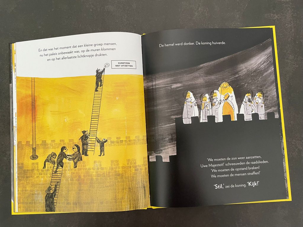 Je kunt natuurlijk als lezer al wel raden dat alleen maar zon en licht helemaal geen goed idee is! Zonder dag geen nacht, zonder licht geen donker. De koning beseft dit niet, want hij heeft zijn zin. Maar de burgers hebben er meer moeite mee. Iedereen is moe. Doordat er geen nacht meer is, leken de dagen eeuwig te duren. Daarom willen ze het donker weer terug. Maar dat krijgen ze niet zomaar voor elkaar. Als je een lamp probeert uit te doen, krijg je een boete van de Lichtinspecteurs. Toch komen ze samen in verzet. Ze bedenken een plan om het donker terug te krijgen.