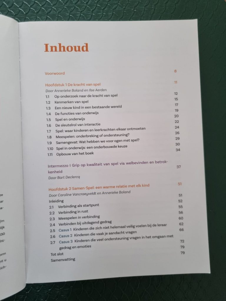 In het eerste hoofdstuk lees je over de kracht van spel voor kinderen in het onderwijs. De relatie wordt hierin gelegd met verschillende bekende onderzoeken naar onderwijskwaliteit, het doel van onderwijs en de verschillen tussen Nederland en Vlaanderen. Dit maakt dan ook dat het boek voor een brede doelgroep is, in beide landen is het zeer goed bruikbaar. Na het eerste hoofdstuk is de veilige relatie tussen kind en leerkracht aan de beurt. Dit is de basis van ontwikkeling, maar hoe pak je dit aan?
