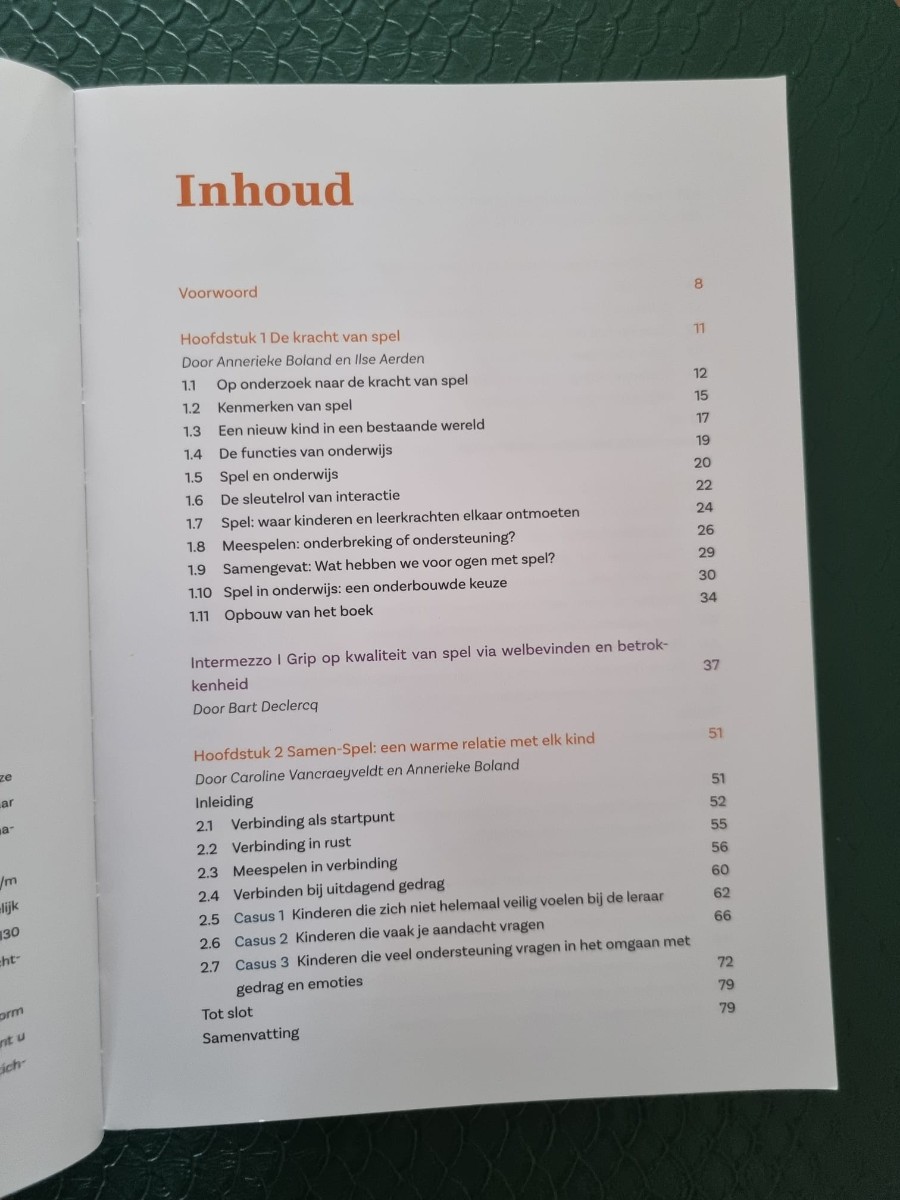 De kracht van spel start met een duidelijke inhoudsopgave. Aangezien de inhoud van dit boek heel divers is, heb ik de inhoudsopgave even voor je op de foto gezet. Zo kun je zien wie aan welk hoofdstuk is meegeschreven en wat de speerpunten zijn.