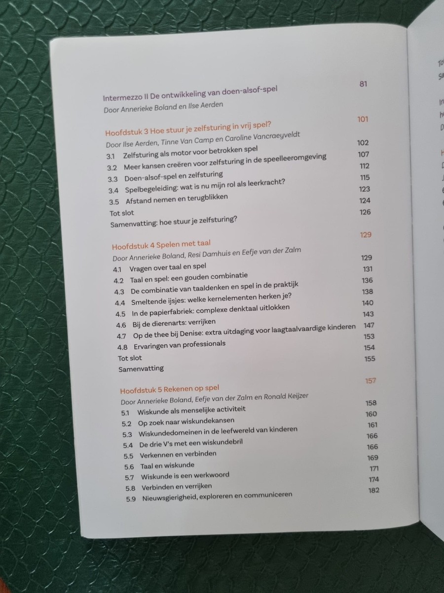 De volgende hoofdstukken in De kracht van spel zijn wat specifieker. In hoofdstuk 3 wordt namelijk ingegaan op zelfsturing. Een sleutelelement in de ontwikkeling van kleuters, maar dat betekent ook iets voor de inzet van spel. De auteurs gaan uitgebreid in op kansen en uitdagingen om te komen tot volledig rollenspel. In hoofdstuk 4 wordt het taaldenken en stimuleren van taalontwikkeling besproken. Heel breed, het is namelijk gericht op kinderen die de taal nog aan het ontdekken zijn en ook heel taalvaardige kinderen. In hoofdstuk 5 wordt dan ingegaan op de rekenen-wiskunde kant van spel. Complexer spel begeleiden, je wiskundige bril opzetten en samen oplossingen verzinnen met kinderen.