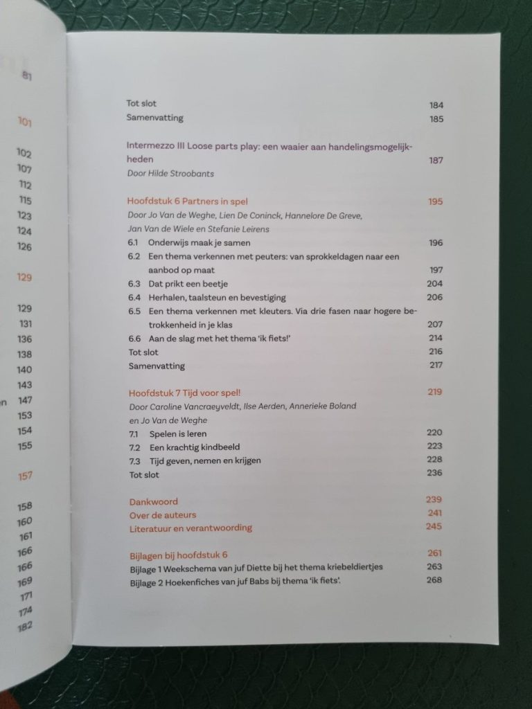 Het volgende intermezzo is de spelontwikkeling van doe-alsof-spel. Hoe ondersteun je die gericht? Ook aan kinderen die dit uit zichzelf minder snel doen. Het laatste intermezzo gaat in op loose parts. Wat een mooi hoofdstuk is dat. Het is namelijk verhelderend, praktisch en toepasbaar! We maakten direct een aantal keuzes in onze bouwhoeken met loose parts, zodat het spel meer verrijkt wordt en de eigen fantasie van kinderen wordt geprikkeld.
