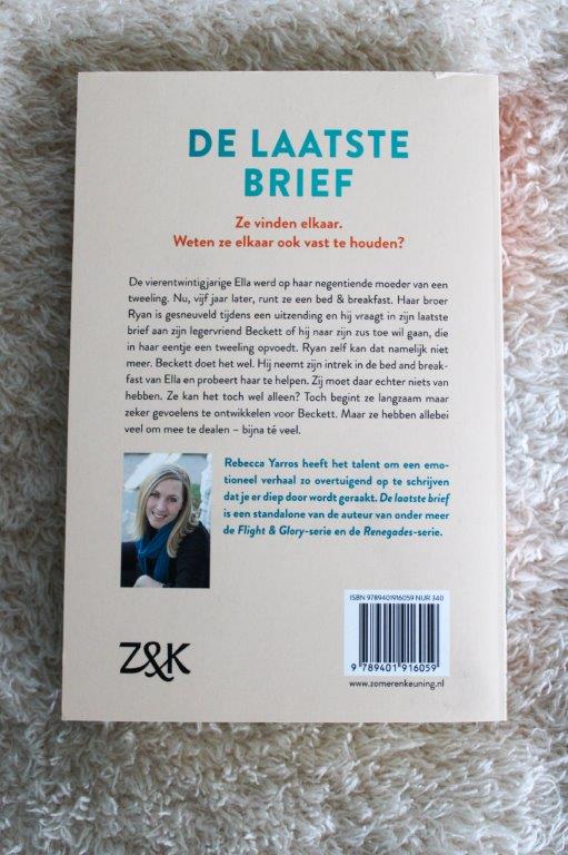 De laatste brief is een standalone roman van Rebecca Yarros. Een zogenoemd standalone boek is een boek die op zichzelf staat en geen onderdeel is van een serie of iets dergelijks. Rebecca schrijft voornamelijk over liefdesrelaties waarbij de man in militaire dienst is. Ze kan als geen ander beschrijven hoe dit is, ze is zelf namelijk al heel wat jaren getrouwd met een Apache-piloot. Samen hebben ze zes kinderen.