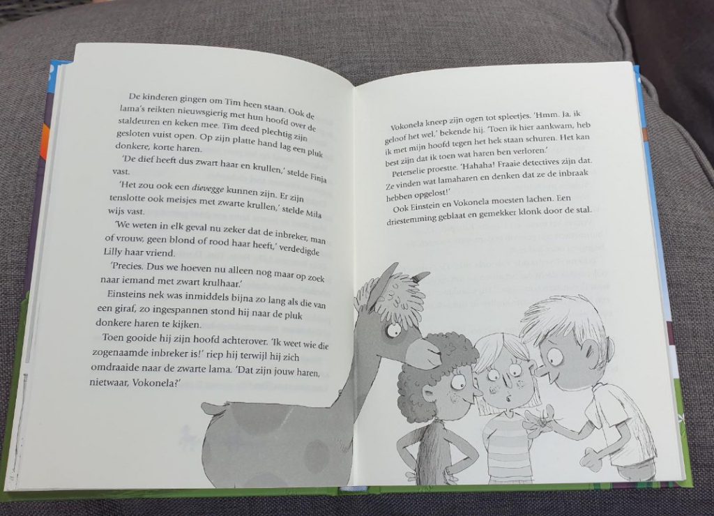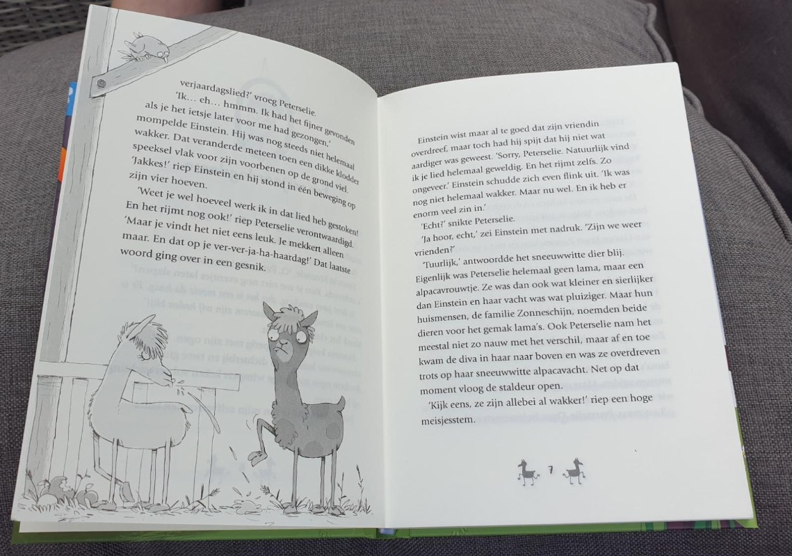 Nikolai Renger tekende grappige illustraties bij de lamabende in grijstinten. Gelukkig is de cover fullcolour zodat je een goed beeld krijgt hoe Peterselie, Einstein en Vokonela eruitzien. Bij de hoofdstukken staan er leuke portretfoto’s van de dieren. De mimieken van deze slimme beesten zijn erg leuk getekend en zijn echt complementair aan de geschreven tekst.
