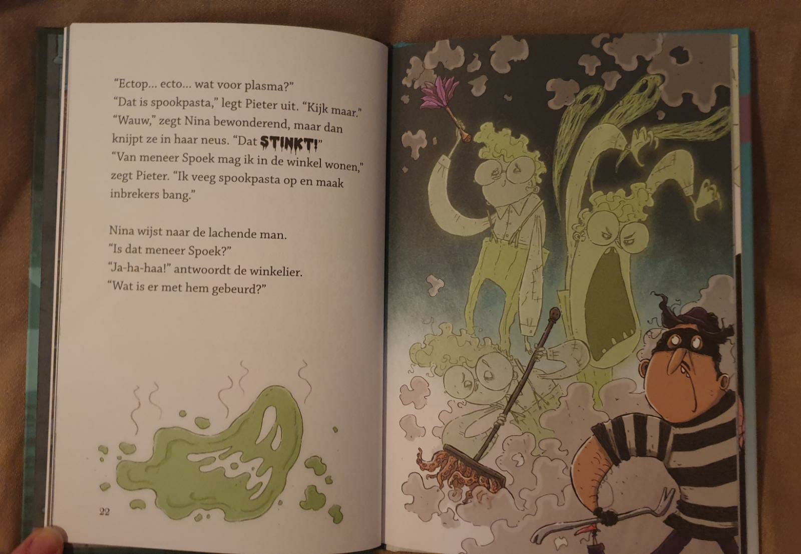 In de nachtmerriewinkel en het akelige jeukpoeder, het eerste deel dus, maken we kennis met de hoofdpersonen uit dit boek. Compleet met positieve en negatieve eigenschappen. Ik moet al direct lachen om de oorzaak van de dood van Pieter de winkelgeest.