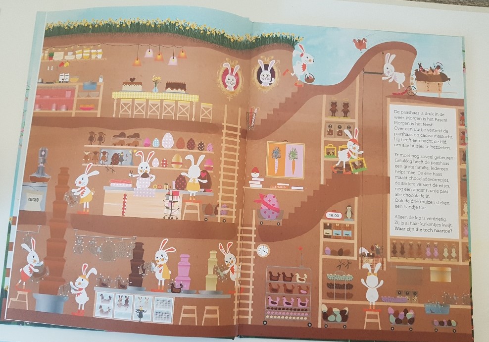 De paashaas is er maar druk mee en zijn huis lijkt wel een fabriek! Er valt zoveel te zien en te tellen en te benoemen dat alleen al met de eerste pagina je zo 10 minuten met je kind kunt vermaken.