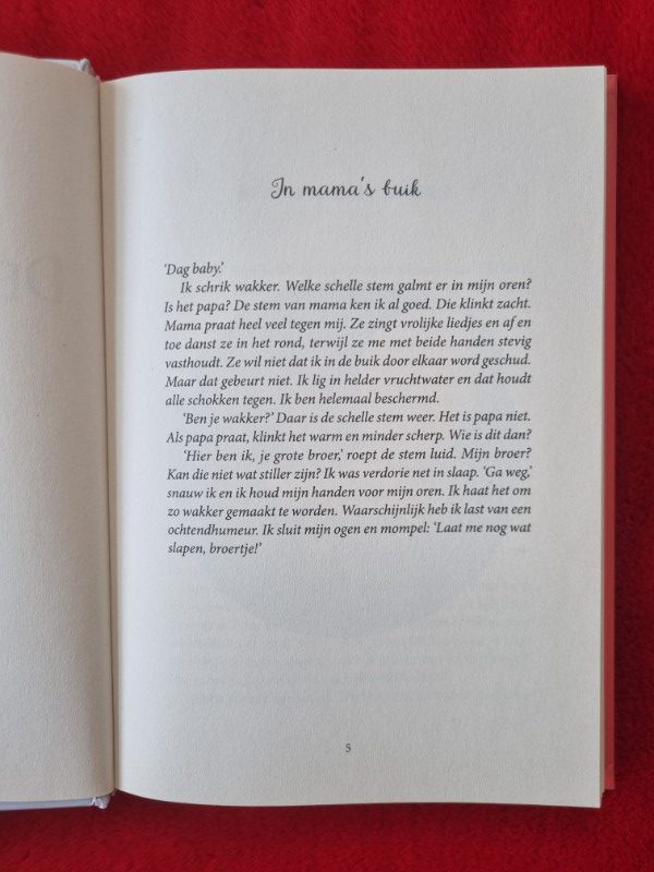Aan de andere kant volgen we Kato in De rode ballon. Vanaf het moment dat haar mama haar kan voelen schoppen tot aan het moment dat ze 1 jaar zou zijn geworden. Kato wordt als toeschouwer van het leven van haar papa, mama en Sem gezien, waarbij ze hen een handje ‘helpt’ waar nodig en lieve woordjes influistert. Niet op een spannende manier, maar juist heel liefdevol beschreven.