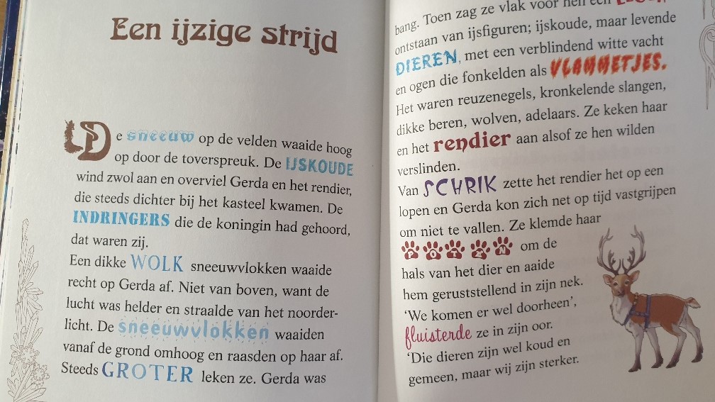 De illustraties in Geronimo Stilton: De sneeuwkoningin zijn geweldig mooi! Heel kleurrijk met lekker veel kleine details. Zo ook de teksten zoals we gewend zijn in de boeken van Geronimo Stilton. Ik vind het leuk om zo tussen de tekst door gekke letters te zien.