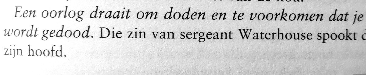 Daarnaast is het heel knap te noemen dat ze de gruwelijkheden, en de verwondingen, die soldaten meemaken en oplopen ook niet schuwt. Sterker nog ze beschrijft net zo makkelijk een prachtig bos bloemen als een afgerukte hand met een nog tikkend horloge eraan. Werkelijk alles komt aan bod, waardoor ik door het verhaal ook daadwerkelijk wel geëmotioneerd of geschokt kon raken zonder