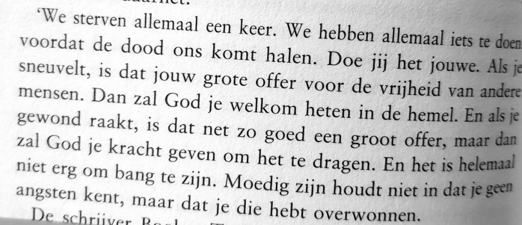 ‘’We sterven allemaal een keer. We hebben allemaal iets te doen, voordat de dood ons komt halen. Doe het jouwe. Als je sneuvelt, is dat jouw grote offer voor de vrijheid van andere mensen. Dan zal God je welkom heten in de hemel. En als je gewond raakt, is dat net zo goed een offer, maar dan zal God je de kracht even om het te dragen. En het is helemaal niet erg om bang te zijn. Moedig zijn houdt niet in dat je geen angsten kent, maar dat je die hebt overwonnen.’’ Uit: De sprong op Normandië – Anke Manschot