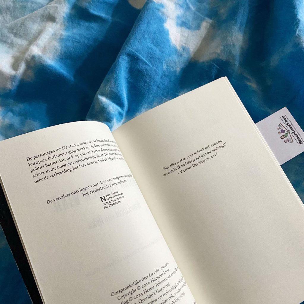 En dan zijn er nog de karakters. Naast de eerder genoemde twee hoofdkarakters zijn er heel veel andere karakters. Ik besef dat het verhaal van De stad zonder wind deels draait om intriges, plottwists en verraad. Ik voel dus de druk ergens om elk karakter te kennen en in mijn vizier te hebben. Na een wat explosieve start in mijn hoofd rolde ik beter en relaxter in het verhaal. En in die explosie wisten er verschillende delen van het verhaal zich in mijn brein te vestigen. Vanaf het begin was ik geïntrigeerd door de prikkeling en het avontuur wat mij toegereikt werd.