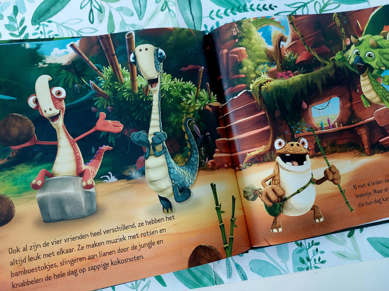 De vier jonge dinovrienden hebben veel lol met elkaar. Maar het is ook best wel gevaarlijk in hun wereld. Spelenderwijs leren jonge kinderen in dit prentenboek over het tijdperk van de dinosaurussen. Het is leuk voorlezen, ondanks al die moeilijke dino namen!