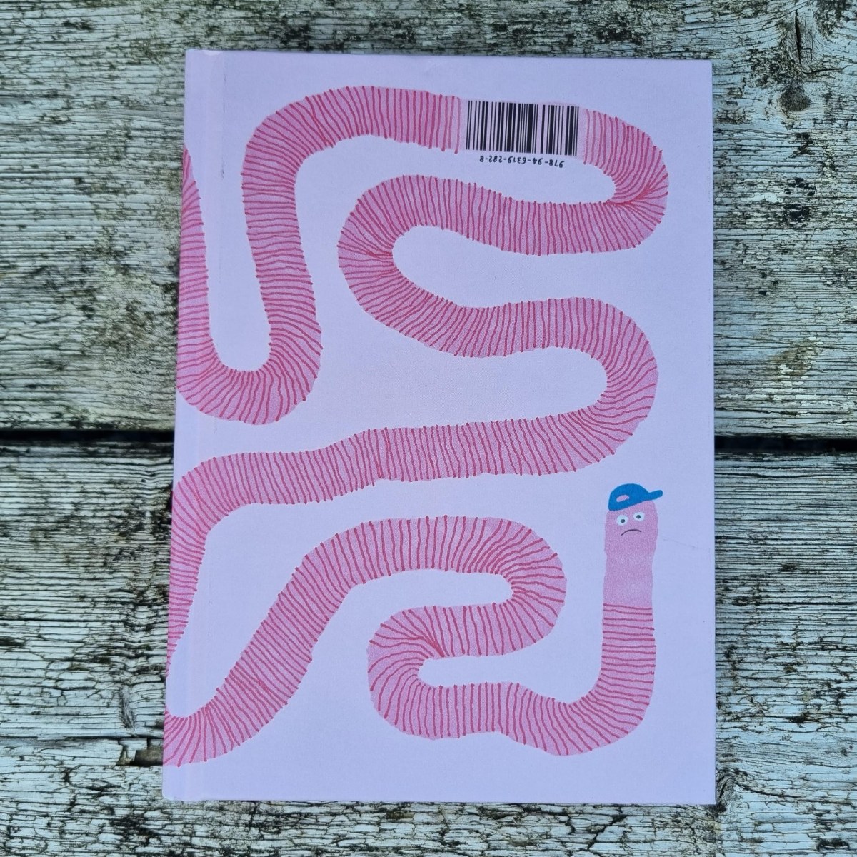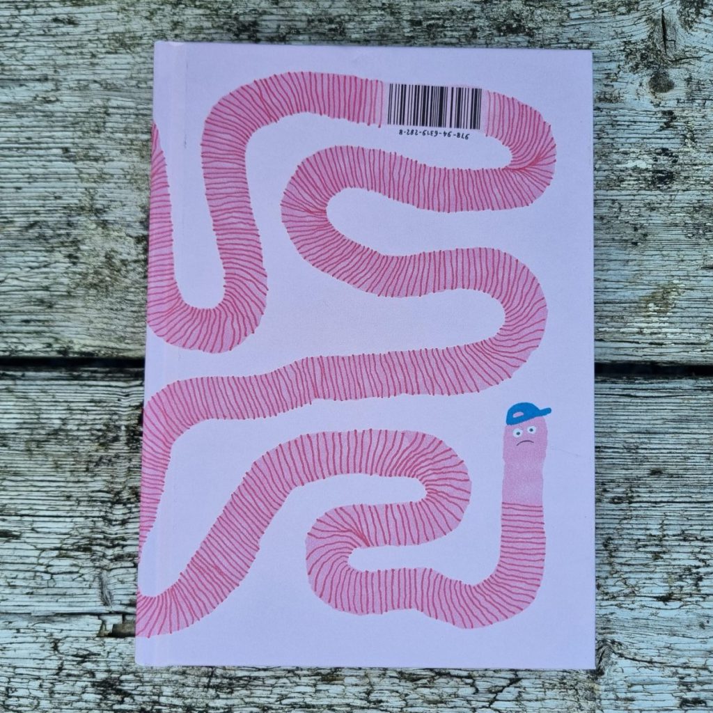 Als je De woelige wereld van de worm in je handen hebt is het boek zeer imponerend. Het weegt namelijk nogal wat. 654 gram om precies te zijn. Ruim een halve kilo vol roze en andere kleuren, over zo’n licht diertje. Onder de indruk bestudeer ik de buitenkant en las ik hardop over de inventieve wijze waarop zelfs de streepjescode is verwerkt in de worm. Zo ‘simpel’, maar goed bedacht. En dat is dit boek. Eenvoud in bladspiegel en woorden, maar zo goed bedacht!
