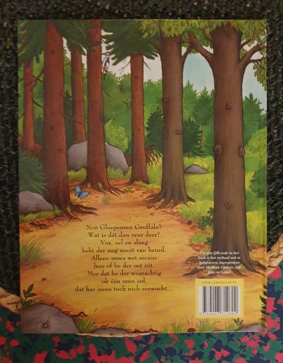 Den Gloepensen Gruffalo komt met leuke extra’s. Zo is er via een QR-code in het boek, het verhaal ook te beluisteren. In ’t Twents is het ingesproken door Herman Finkers compleet met natuurgeluiden. Het is heerlijk om ernaar te luisteren en voor mij ook weer erg handig om ’t Twents een beetje op te halen. Het is gewoon het bekende verhaal, met een paar kleine aanpassingen. Vooral het dialect brengt toch een andere energie mee.