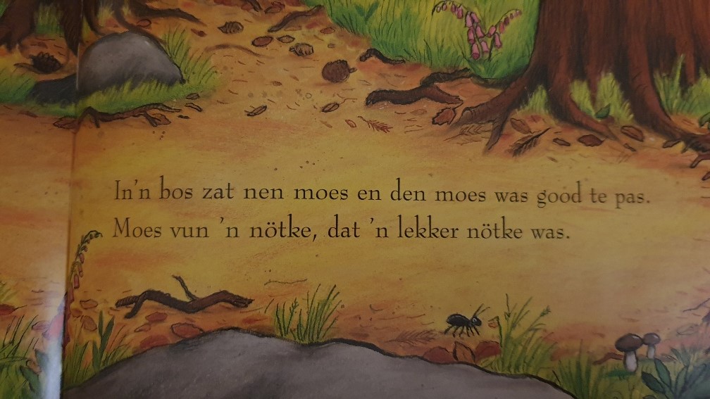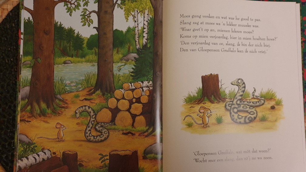 Als ik Den Gloepensen Gruffalo probeer voor te lezen schiet iedereen aan tafel in een schaterlach. Klinkt voor geen meter natuurlijk haha. Vroeger toen we geregeld bij mijn man zijn schoonfamilie kwamen, en de grootouders nog leefden kon ik best een stukje plat proat’n en in elk geval redelijk goed verstaanbaar.. maar die kennis is flink weggeebt..