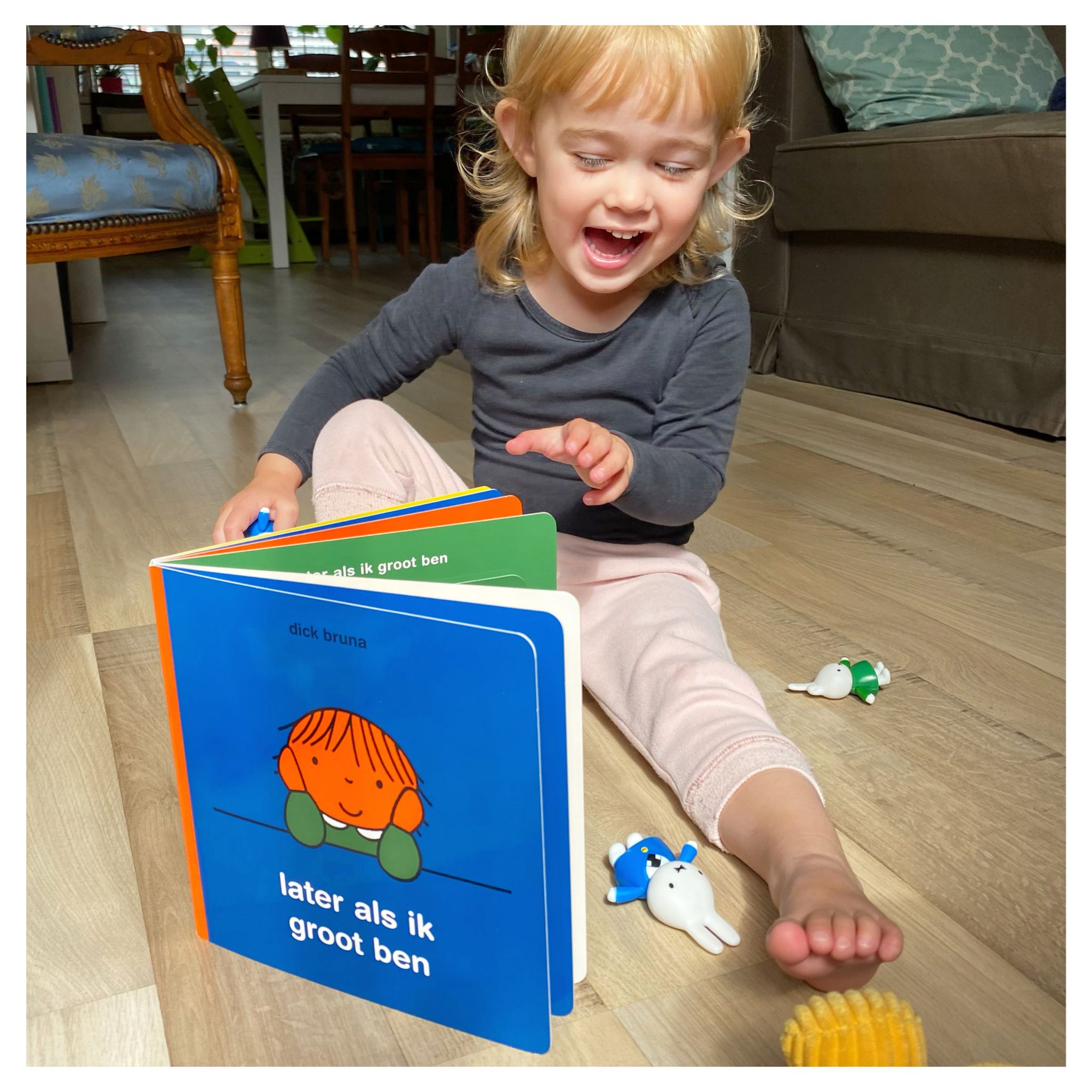 Ze is twee en de wereld ligt aan haar voeten. Later is echt iets te concreet nog maar Dick Bruna Later als ik groot ben is aangenaam vertrouwd voor haar. De kleuren, de tekeningen en afbeeldingen. Ze herkent veel! Mijn oudste dochter zit erbij en die is al meer bezig met later. Dit boek is ook voor haar leuk want bij elk beroep hebben we een kort gesprekje over wat ze wel of niet leuk zou vinden daaraan.