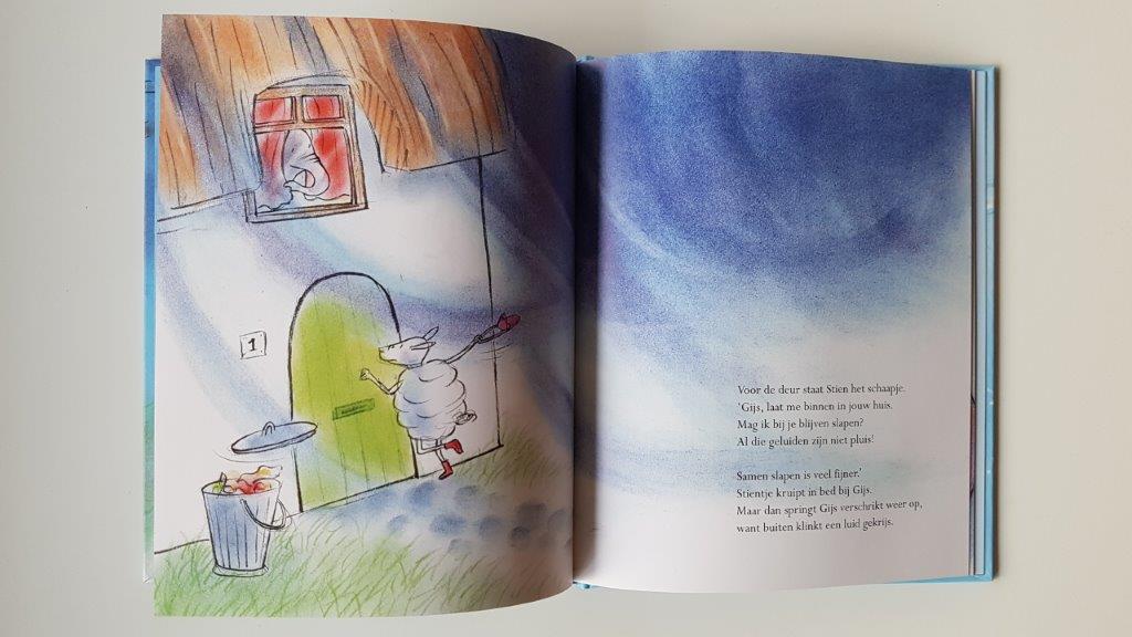 Het is slecht weer in Dierendorpje in de maneschijn. Op rijm vertelt het verhaal dat de bomen kraken door de storm. Op het mooi gemaakte plaatje op de eerste bladzijde zie je Gijs de olifant tussen de gordijnen naar buiten kijken. Je ziet het echt hard waaien. En als Stien het schaapje voor de deur staat, vliegt de deksel van de prullenbak voor de deur. Haar tasje waait ook bijna uit haar hand.