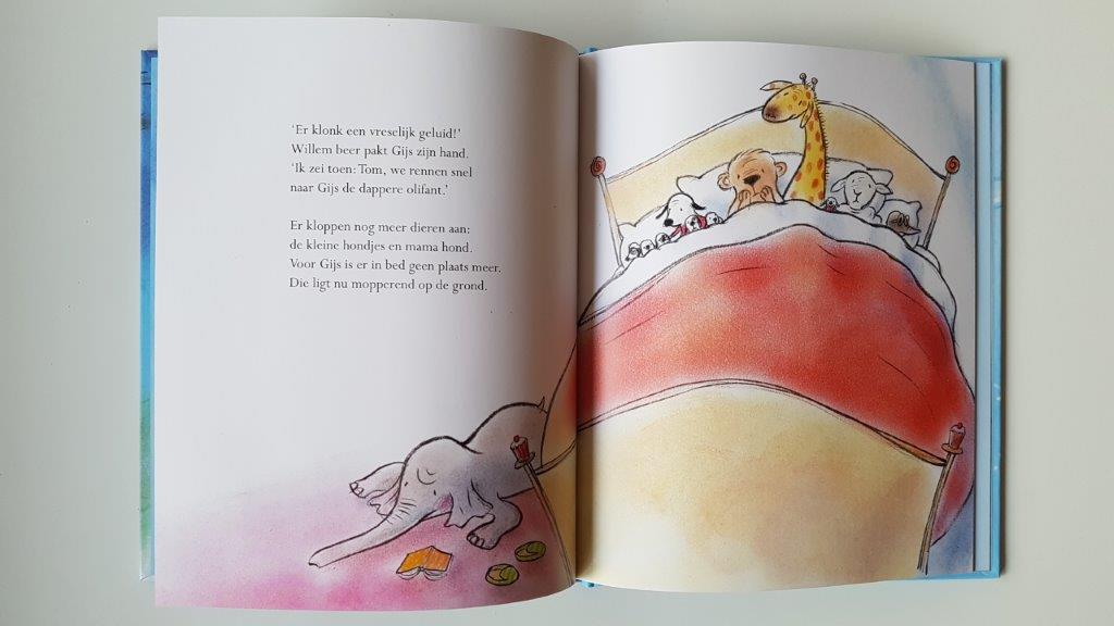 Het stormt in Dierendorpje in de maneschijn. En de dieren kunnen niet slapen door alle vreemde geluiden die ze horen. Ze zijn allemaal bang in het donker en daarom vluchten ze naar de dappere olifant Gijs. Uiteindelijk is er voor Gijs zelf geen plek meer in zijn eigen bed. Hoe zal hij dit oplossen?