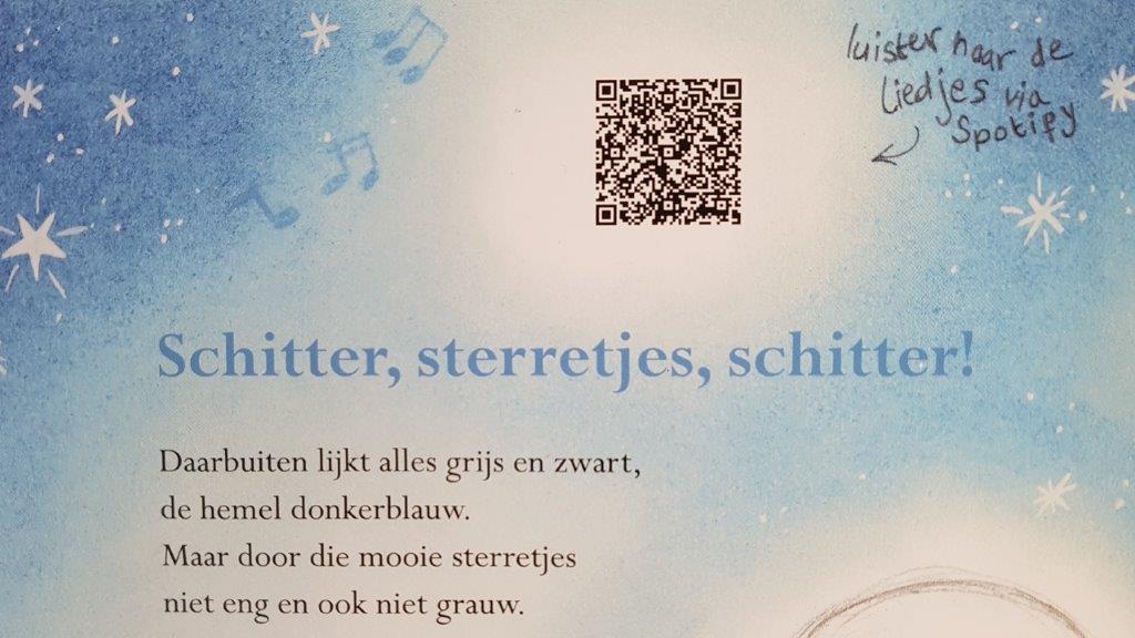 Kim-Lian van der Meij schreef samen met Gitte Spee lieve voorleesboeken op rijm voor peuters en kleuters. En Kim-Lian heeft ook het lied waarmee elk boek eindigt op muziek gezet en ingezongen. Dus ook van Dierendorpje in de maneschijn. Op de laatste pagina staat de tekst van het lied ‘Schitter, sterretje, schitter’. En daarbij een QR-code om de hele afspeellijst van de Dierendorpje serie via Spotify te beluisteren. Toen ik deze aanzette, was mijn zoontje meteen vergeten dat het buiten stormt en donker is.