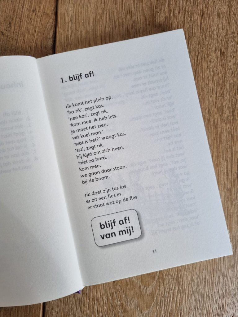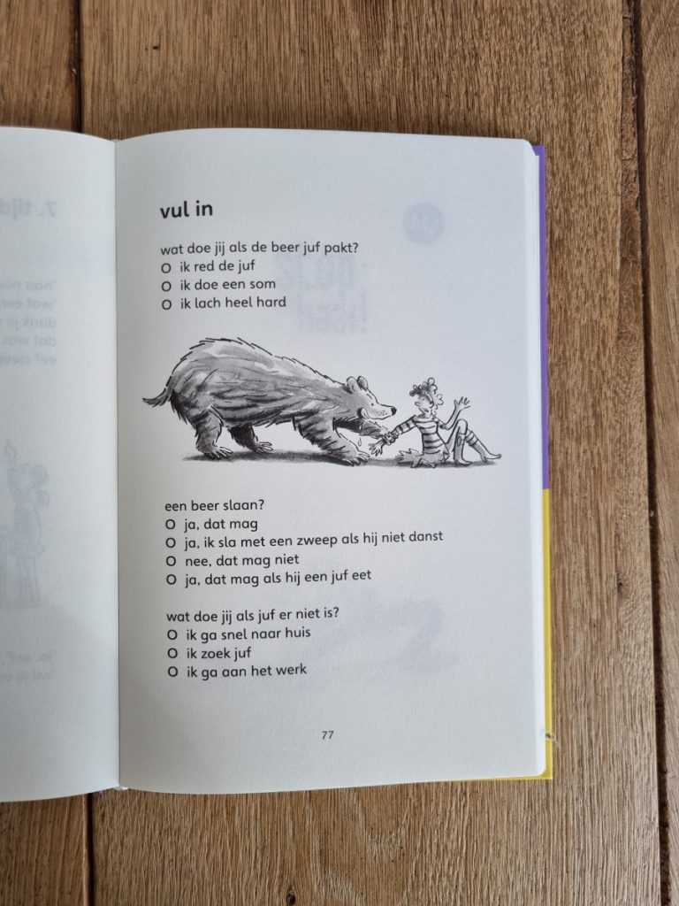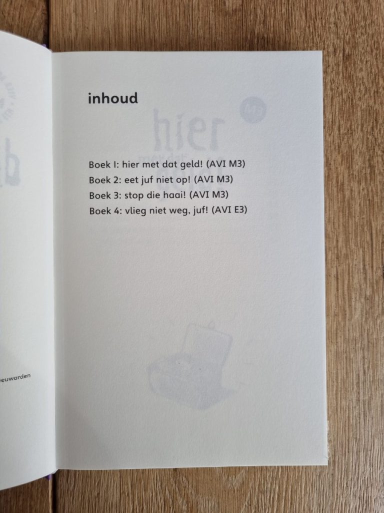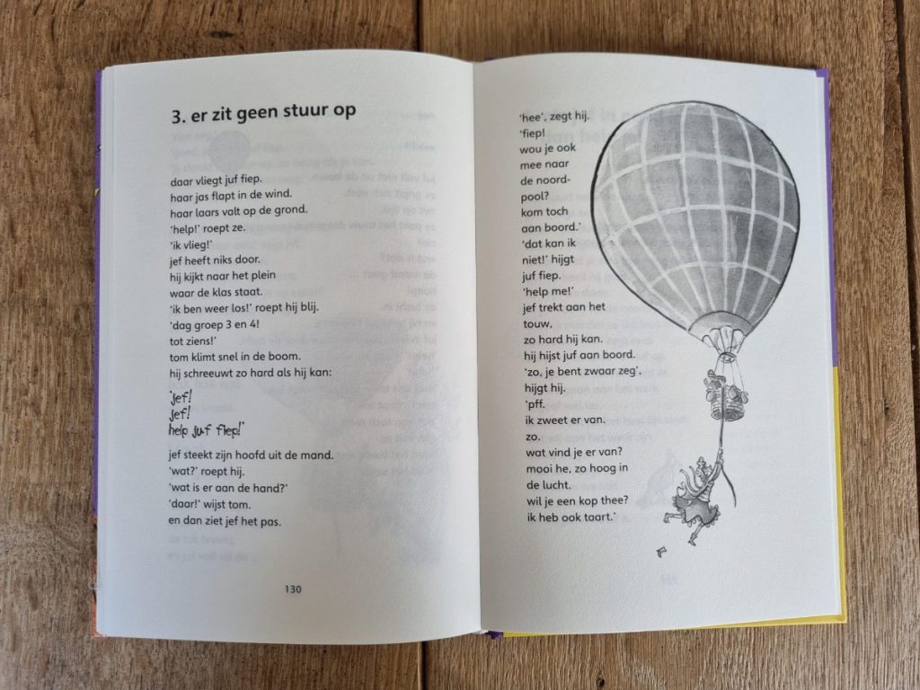 Probeer niet te blijven hangen in het leesniveau die past bij het verloop van het jaar, maar ga met je kind zo snel mogelijk een hoger niveau lezen. De verhalen worden namelijk veel rijker zodra er wat moeilijkere woorden worden gebruikt. Dit kun je bijvoorbeeld zien in ‘Stop die haai’ uit Dikke juf Fiep 2. Daar staat het woord ‘zwemmen’ niet in, omdat dit nog niet past bij M3. Toch heeft Corien Oranje wel wat woorden kunnen toevoegen die uitdagend zijn voor kinderen van groep 3. Bijvoorbeeld het woordje ‘cel’. Daar word ik gelukkig van! Een beetje uitdagen en rijkere taal gebruiken is nodig in boeken voor groep 3.