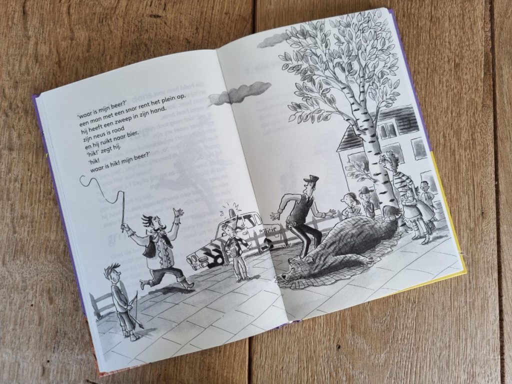 De illustraties in Dikke juf Fiep 2 zijn gemaakt door Marja Meijer. Op de voorkant prijkt een bange juf in een boom, met een groet beer onder haar. Een geweldig detail vind ik de hoge laarzen die deze juf draagt. In het boek zelf zijn de illustraties in grijstinten, maar wel heel aansprekend. Het boek is leuk vormgegeven, de tekeningen staan verspreid door het boek en ondersteunen de tekst zonder te veel weg te geven. Dat is voor mij een belangrijk criterium als ik een boek zoek. Als de plaatjes te veel details laten zien gaan kinderen soms radend lezen (naar de plaatjes kijken in plaats van goed lezen wat er staat). Ze maken dan veel fouten en oefenen niet het technisch lezen.