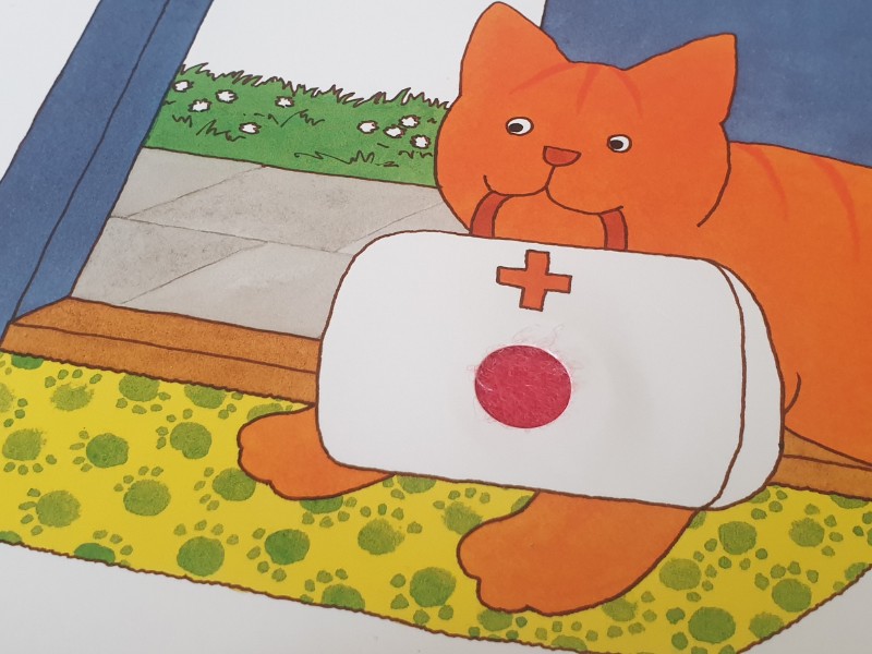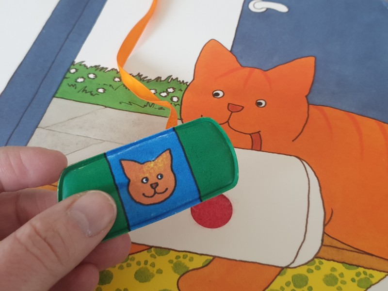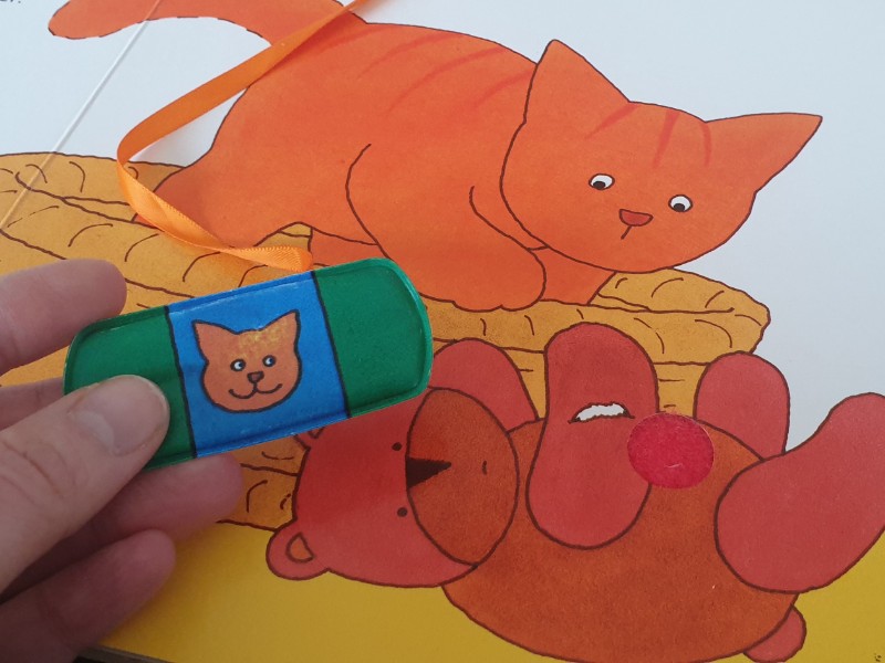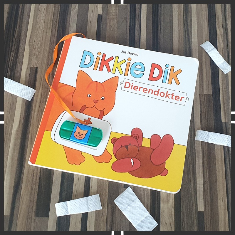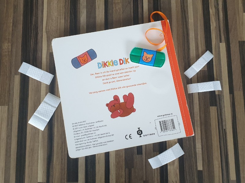 Aan dit stevige kartonboek hangt een koordje met een klittenbandpleister. Die pleister kan op elke spread geplakt worden en zo kunnen peuters samen met Dikkie Dik alle gewonde vriendjes verzorgen. En als Dikkie Dik aan het eind zelf ook een pleister wil, dan mag dat natuurlijk!