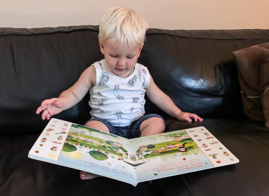 Hoewel Tim en Stef lang niet alle verhalen kennen die in het boek aan bod komen, worden de platen aandachtig bekeken. In de illustraties herken je direct dat het van Disney is, al hebben de figuren een flinke verjongingskuur gehad. Ik denk dat ‘Disney mijn eerste woordjes’ daarom ook zo aanspreekt. Voor Stef zijn de figuren die hij al kende goed herkenbaar en bij Tim prikkelen ze voldoende zijn nieuwsgierigheid.